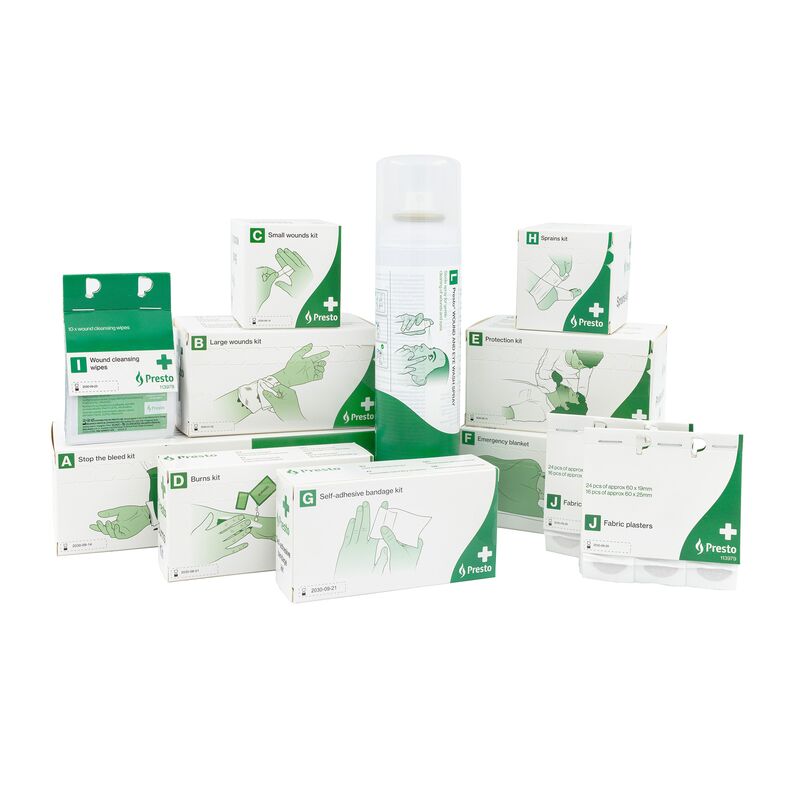 - Verbrennungen (Set): Verbrennungsgel, Verbrennungskompresse. Schutzset, Rettungsdecke, Augendusche 250 ml. Selbstklebende und elastische Binden, Wundreinigungstücher. Pflasterautomat mit Textilpflastern (beige oder blau, detektierbar).